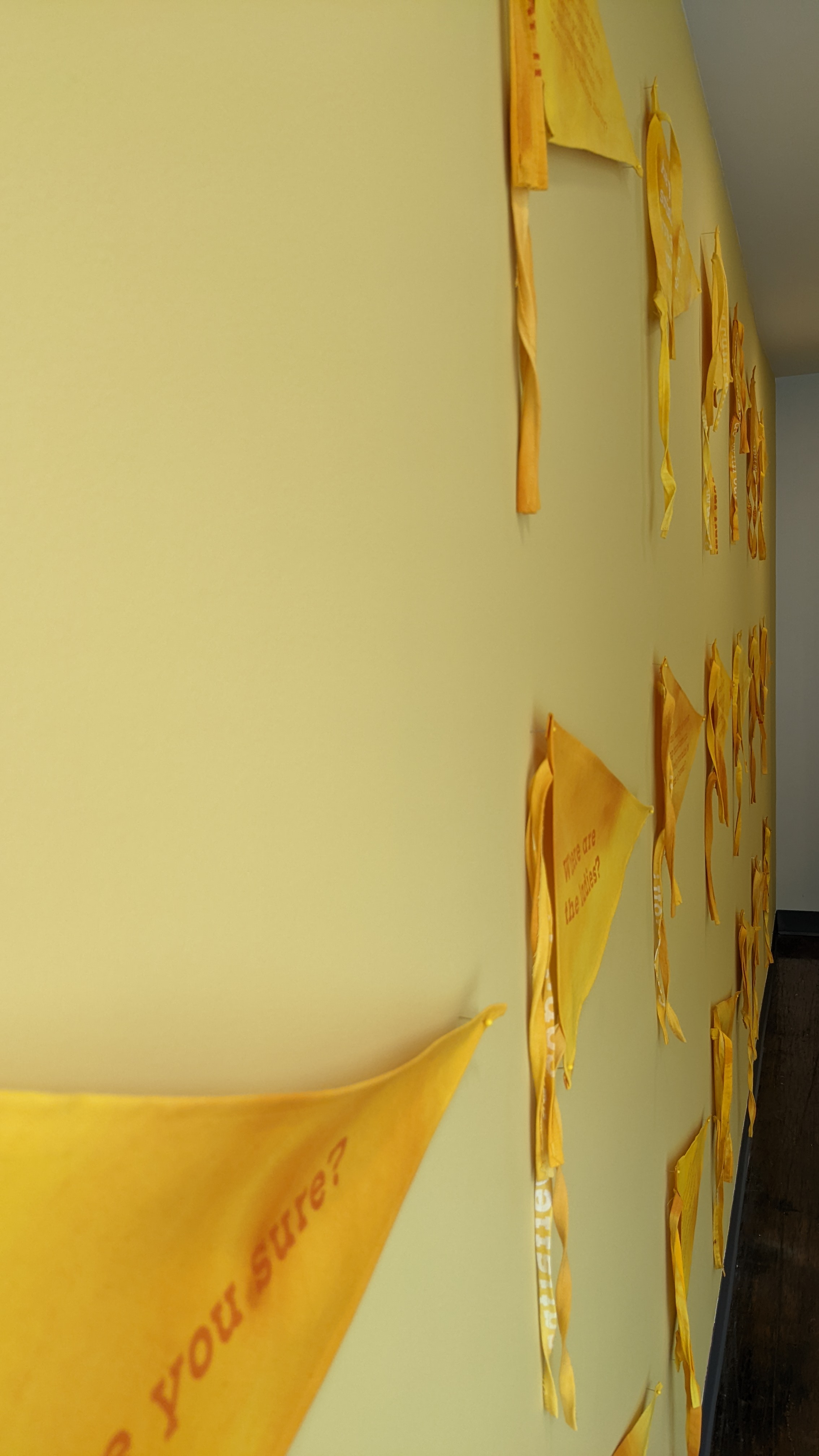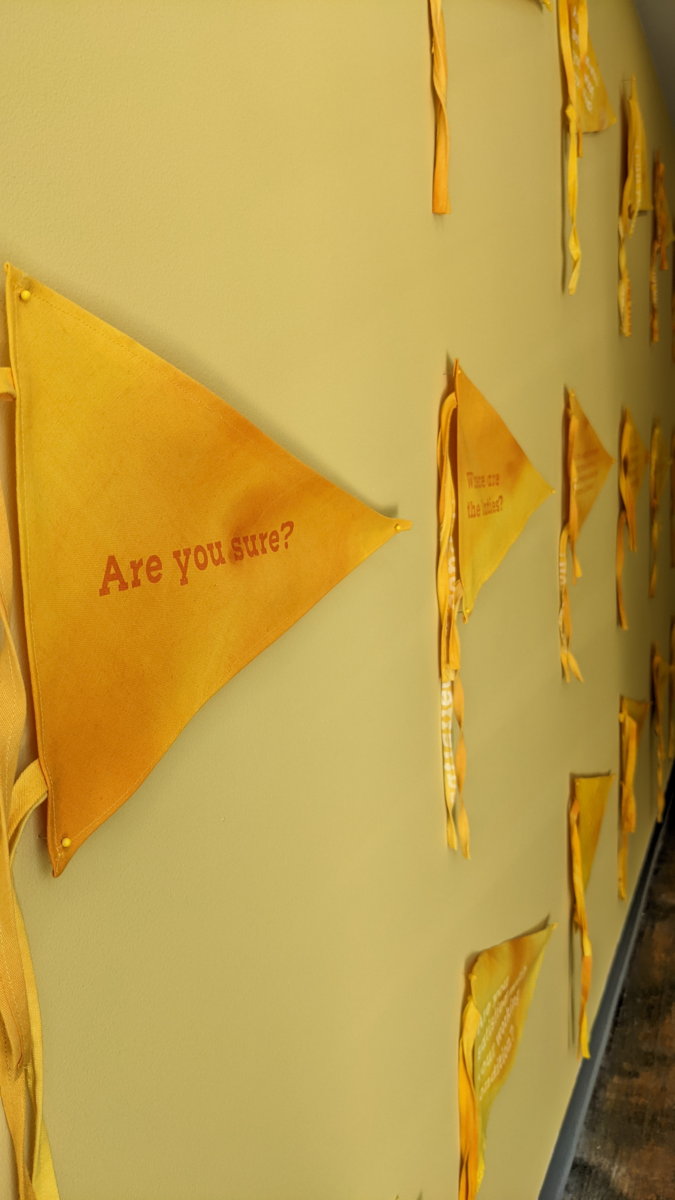 The pennants feature questions like, “Are you aware?" -- "Are you awake?" -- "Are you alive?” --- and other various questions asked by feminist activists throughout American history. Installed en masse, these pennants function within a structure of cooperative interdependence. Each pennant displays questions that I have selected from feminist writing, calls to action, and printed ephemera. Removed from their context and placed amongst one another, they take on new and ever-changing interpretations.